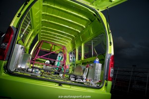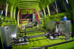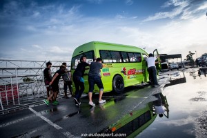สำหรับรถตู้ ดูอาจจะได้เปรียบรถกระบะอยู่บ้าง เพราะช่วงท้ายมันมีหลังคามาถ่วงน้ำหนักเอาไว้ แต่เอาเข้าจริงๆ ตอนรื้ออุปกรณ์ออกทั้งหมด ท้ายรถก็จะค่อนข้างเบาอยู่ดี เพราะมันแทบไม่เหลืออะไรอยู่เลย และรถรุ่นนี้เป็นแบบโมโนค็อก ไม่เหมือนรถแชสซีที่ยังมีน้ำหนักมาช่วย ตำแหน่งคนขับก็ไปนั่งหน้าสุด ทำให้น้ำหนักตกด้านหน้ามากขึ้น ก็ต้องย้ายอุปกรณ์ที่สามารถย้ายได้ไปด้านหลัง เพื่อช่วยถ่วงน้ำหนักให้สมดุลมากขึ้น คันนี้ก็ยังใช้ฝาท้ายเดิมที่เป็นเหล็กอยู่ ส่วนตัวคิดว่าเจตนาจะเอาน้ำหนักถ่วงไว้อีกส่วนหนึ่งก็เป็นได้…